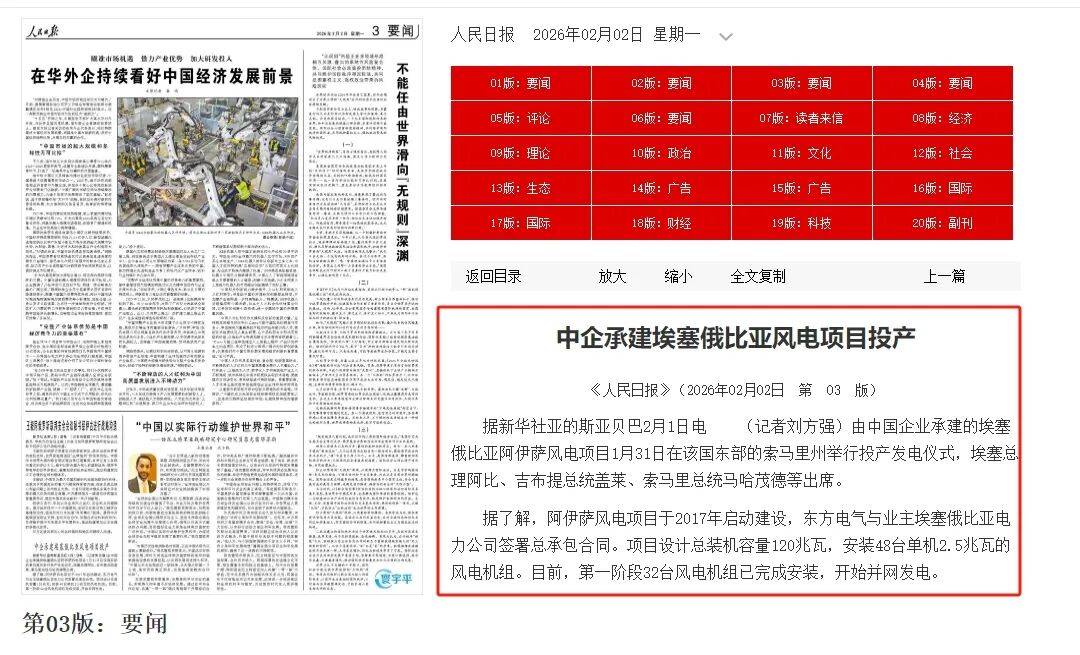 1月31日,由东方电气集团所属东方国际承建的埃塞俄比亚最大风电项目阿伊萨风电项目举行首期工程发电投产仪式。埃塞俄比亚