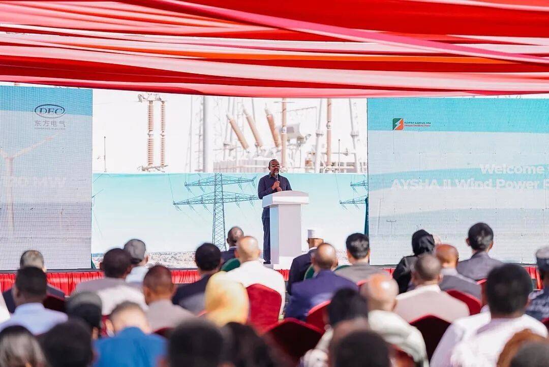 阿伊萨风电项目是埃塞俄比亚迄今规模最大的风电项目,总装机容量达120兆瓦。项目共安装48台风电机组,均由东方电气研制提供,并配套建设完整的风场、变电站及输电线路工程。作为埃塞俄比亚重要绿色能源基础设施,项目建成投产后,将为亚吉铁路经济走廊建设提供可靠电力保障,并提升埃塞俄比亚对吉布提的电力出口能力。
