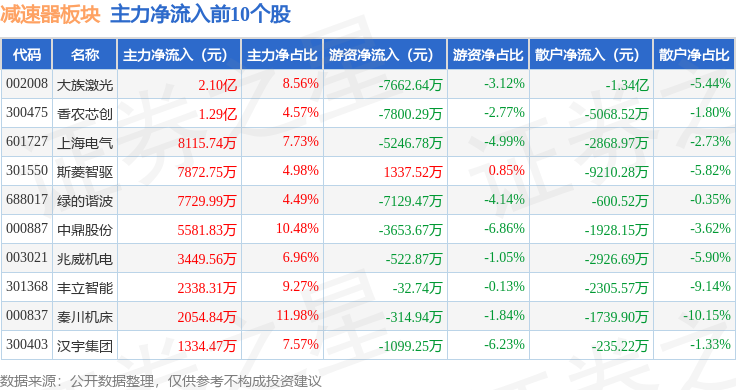 从资金流向上来看,当日减速器板块主力资金净流入5.39亿元,游资资金净流出4.63亿元,散户资金净流出7628.42万元。减速器板块个股资金流向见下表:
